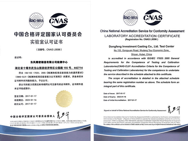 接中國合格評定國家認(rèn)可委員會(CNAS)通知:東風(fēng)精密鑄造有限公司檢測中心認(rèn)可資格已于2017年01月17日獲批準(zhǔn),檢測中心通過CNAS認(rèn)證。